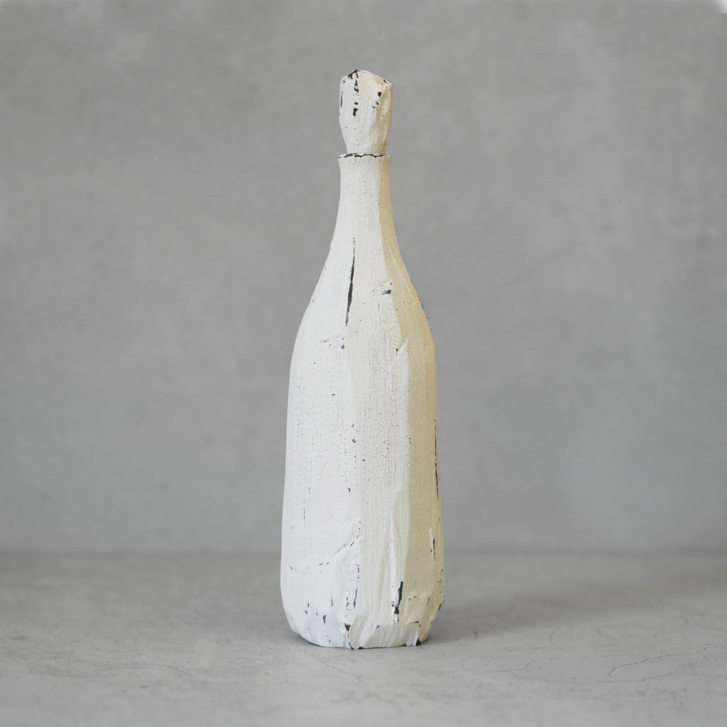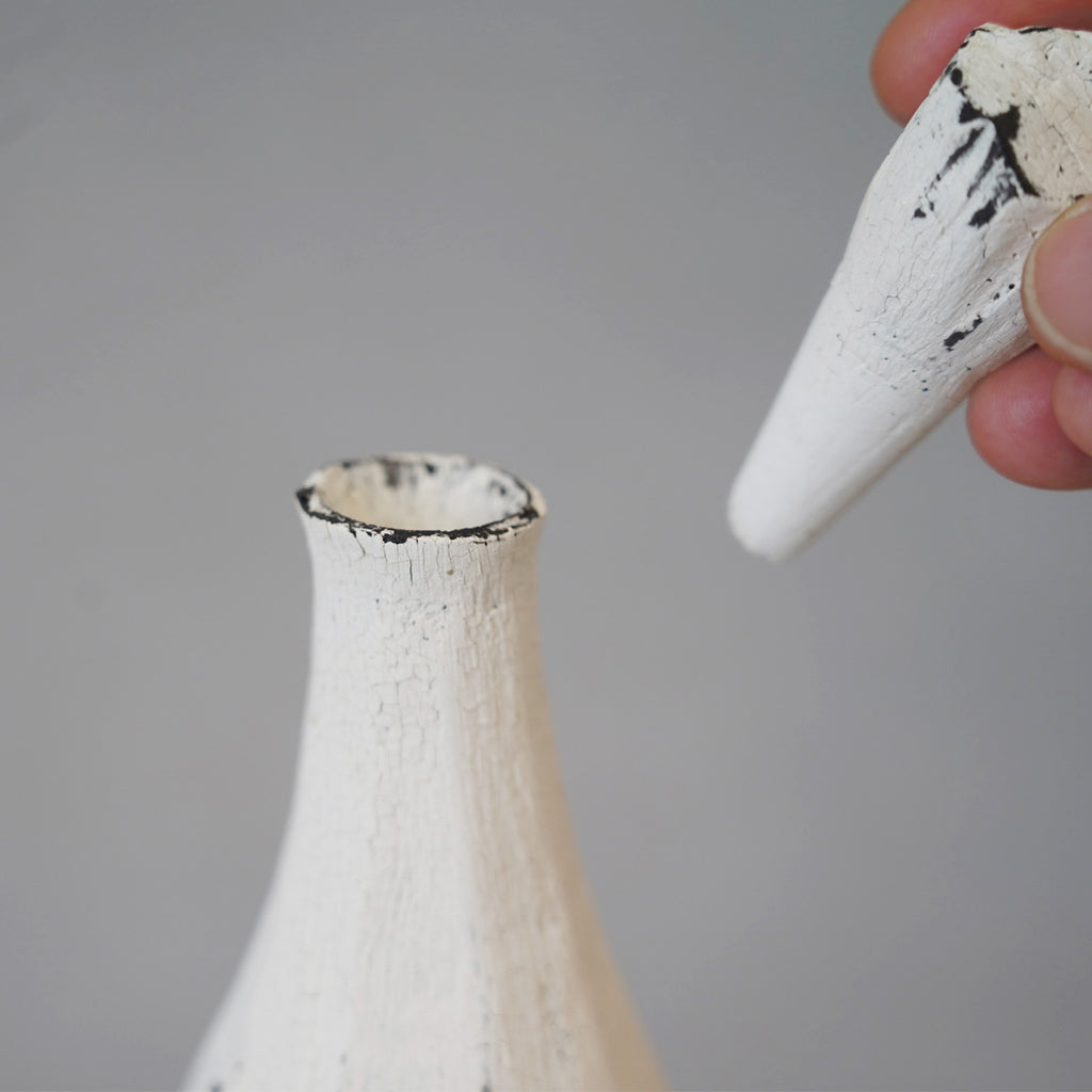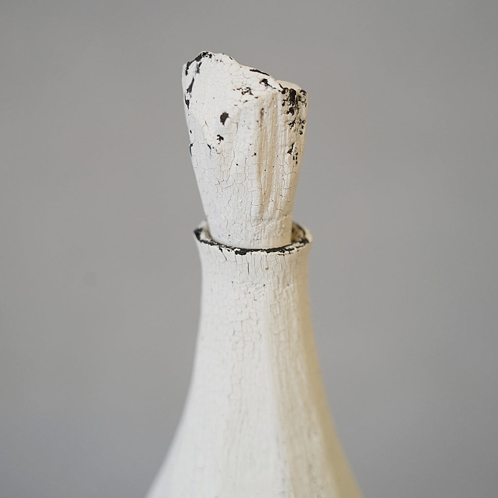 Wheel thrown and hand carved Bottle with Stopper, black stoneware clay, white crackle glazed exterior with a matt glaze interior.