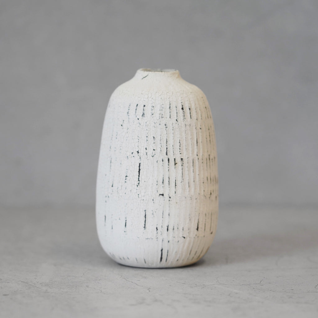 Wheel thrown Bud Vase in a black stoneware clay. Once the form is thrown the surface is then meticulously carved to create a repetitive pattern.